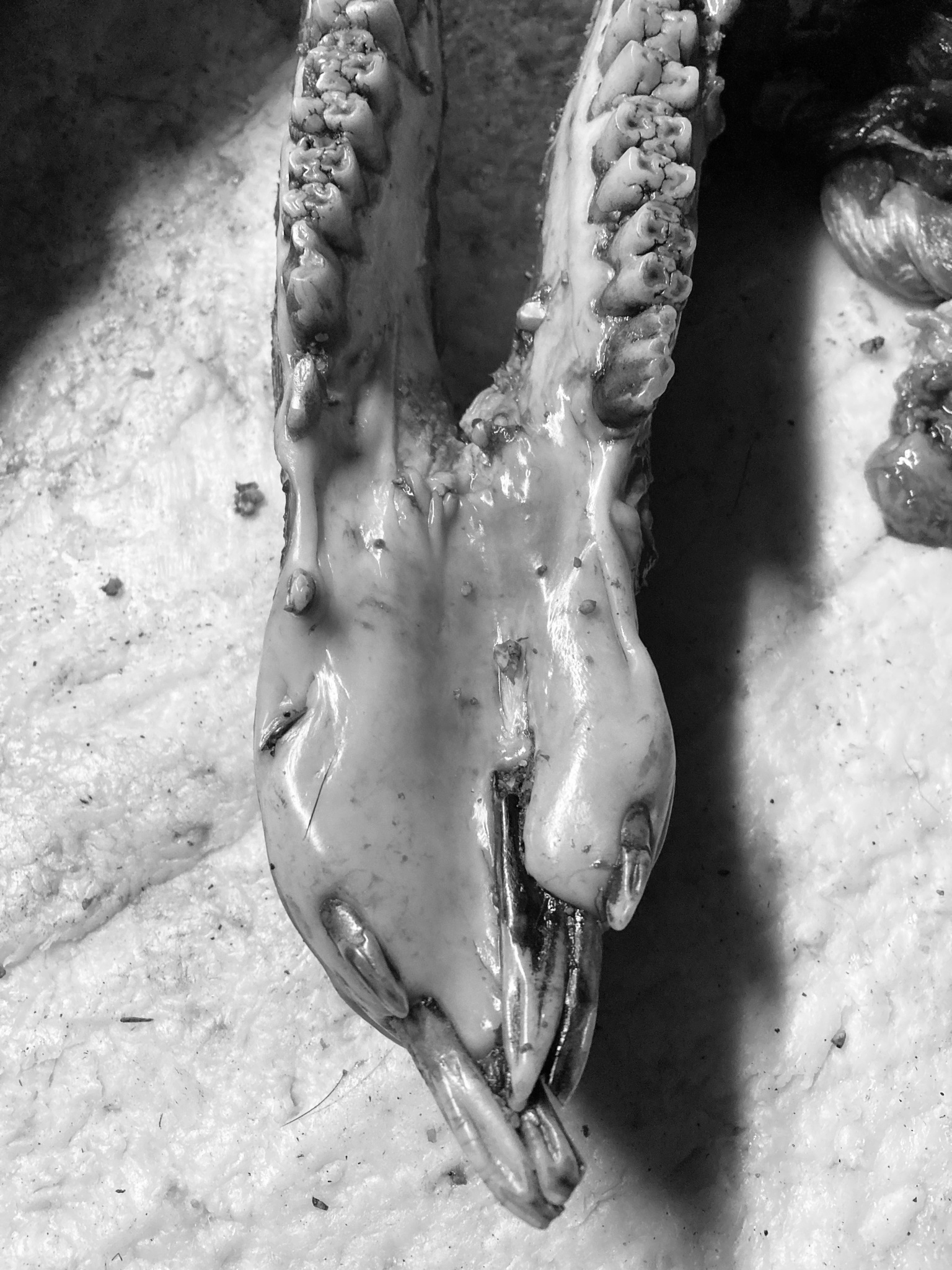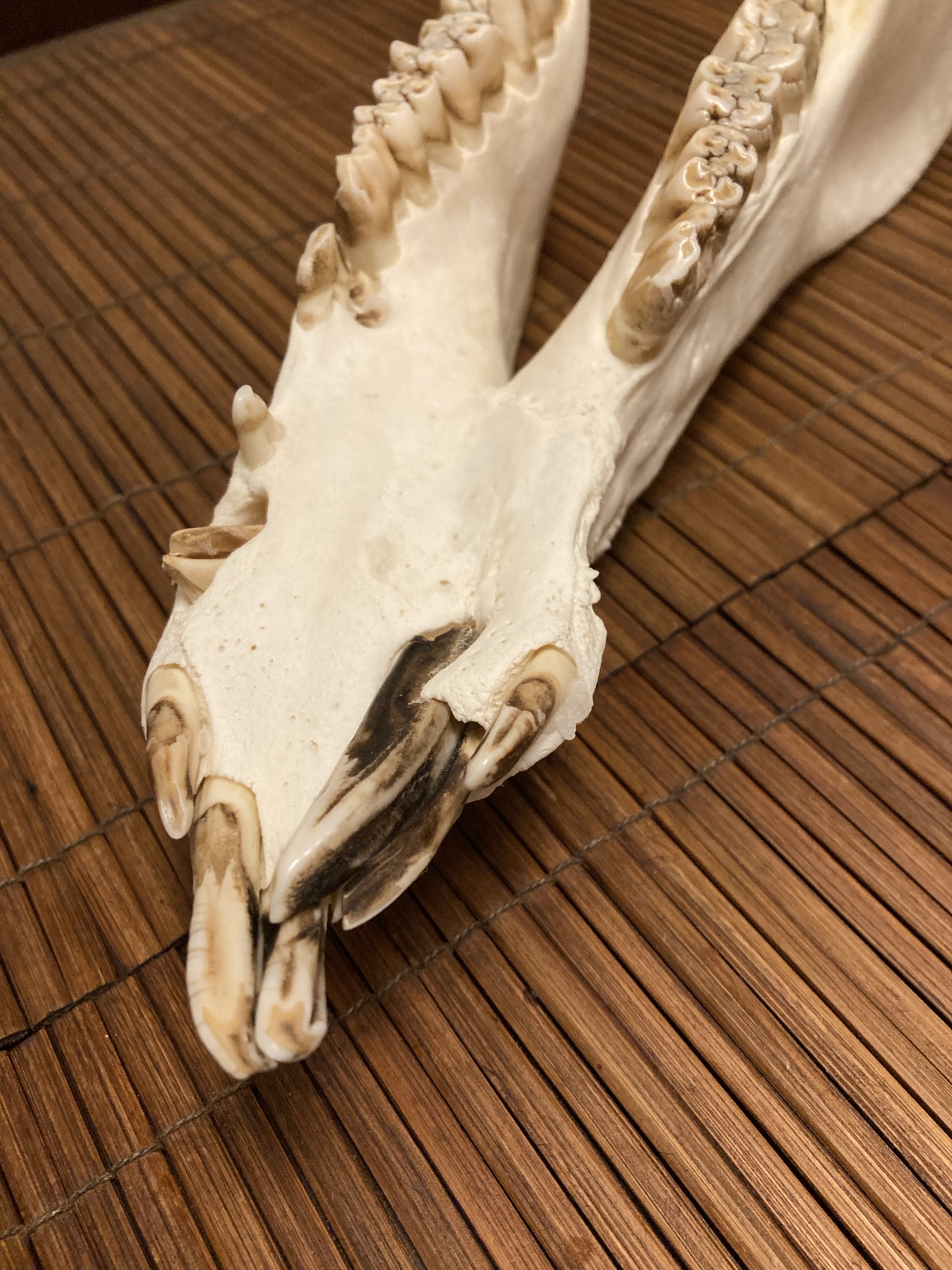 Schon vor dem Abkochen kann man am Unterkiefer gut erkennen, dass unser Bursche hier in seiner Jugend eine schwere Verletzung auskuriert haben muss. Die Fehlstellung der Schneidezähne und die fehlenden Gewehre deuten darauf hin.