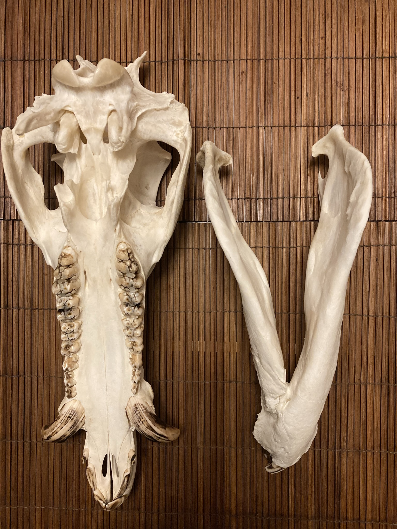 Zwei weitere Tage später liegen die fertig präparierten Ober- und Unterkiefer vor uns. Die verheilte Bruchstelle im Unterkiefer ist ganz deutlich zu erkennen, während der Oberkiefer komplett unbeschädigt ist.
